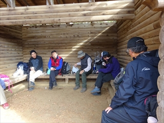 山頂からの眺めをひととおり楽しんだ後、神社でお参りしてちょっと下ったところに小屋があり、そこは南側が開けて長椅子があり二人連れの登山者が休んでいた。そこに我々もお邪魔して昼食タイムとする。のんびりカップラーメンとおにぎりを食べ、配られたお菓子でコーヒータイムを楽しんだ後、いよいよ下山する。