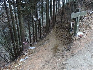 分岐のシラジクボからは山の斜面を下っていくが、最初は道が細く踏み外したら坂に転がっていきそうな箇所があったので慎重に下る。やがて持山寺跡分岐に差し掛かり、ここで広い林道にそって下っているとひとりの登山者が立ち止まっていてどうやら道を間違ているとのこと。そこでYAMAPなどスマホ地図で確認するとやはり間違っていたので、引き返してもとの登山道に戻りさらに下っていく。