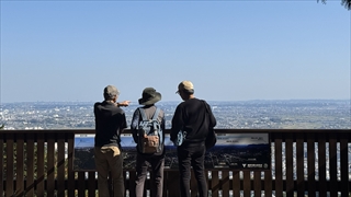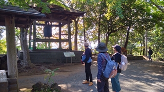 権現山から公園になり、広い道を弘法山に向かってのんびり歩く。ほどなくして弘法山に到着、ここもちょっとした広場になっており、鐘があり案内板によれば正午に鐘が突かれるとある。広場の端にあるテラスから相模平野、それに相模湾が望める。スカイツリーも見えるらしいが霞んでいてちょっと確認できなかった。時刻もそろそろ12時近くになったので鐘のところで待っていたが、結局鐘が突かれるのは昔の話でなんの変化もなかった。