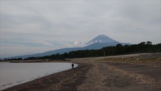 さてここから宿泊所の「はまゆう」に向かって歩き、「はまゆう」の中庭を通って海岸に出た。そこからは雄大な富士山を眺めることが出来た。ただ空には薄い雲がかかっていて青空がバックという訳ではなかった。