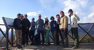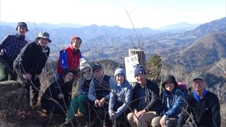 うどんを食べた後、皆さんから配られたお菓子で温かいコーヒーを楽しんだ後、展望台の先端まで行って眼下に広がる甲府盆地と富士山、その周りの山々の景色を楽しむ。またまた全員の記念写真を取って下山する。下山道は南斜面で太陽の陽ざしがあたって暖かい。30分ほどで下山口に到着。