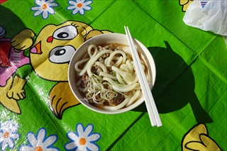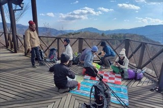 展望台には一組(5人)がテーブルを占領していたが、風もなく暖かいので広いデッキにビニールシートを敷いてうどん鍋の準備を始めた。4台のコンロを使い、お湯を沸かす人、茹でうどんを温める人、スープ用のお湯を作る人、牛丼の具の温める人など自発的に作業を分担し、ほどなくして暖かいうどんが完成した。各自自分のお椀にいれたスープにうどんを入れ、刻みネギ、昆布などを加えて食べ始める。