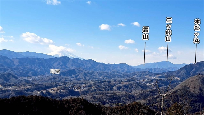 能岳に着くと周囲の木々が伐採されているせいか文字通り360度の大展望。中央線の山々の他、反対側の丹沢山方面も望める。また山頂直下にあるのゴルフ場や山の麓にある集落もはっきり望めた。真っ白な富士山も望めたが臨めたがてっぺんは残念ながら白い雲に覆われている。ここ低山にも関わらずとても見応えのある景色である。しばらく大展望を眺めていると我々とは別方向から上がってきたグループからこの先に赤い鳥居があるので、ぜひ見に行くように勧められた。さっそく荷物をこの頂上にデポして急な坂を5~6分下る。200mmほど下り鞍部に着くとそこには真っ赤な鳥居が富士山方向に向けて建てられていた。ちょうど富士山を鳥居の中に入れて写真を撮れるように作られ、雲のかかってない富士山ならばきっとインスタ映えする写真が撮れるであろう。