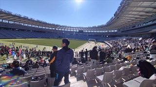 会場の味の素スタジアムに到着し、日の当たる場所を確保した。昨年と同様5人1チームの2チームで出場で私はAチームの3番目ということで、これも昨年と同じであった。