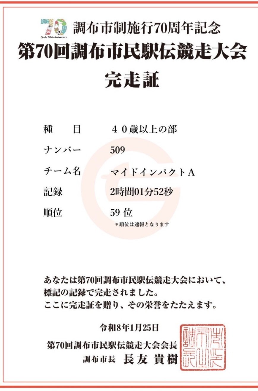 この調布駅伝は今回が70回目ということで歴史のある大会であり、この私を誘ってくれたNさんも調布に住む仲間でもうずいぶん昔から参加しているとのことであった。参加費もチームで5,000円、一人当たり1,000円で参加賞としてTシャツやスポンサーの食品ももらえる。私は調布市民であるメンバーの代理として走ったが、調布市民にとって健康増進としての行事ということのようなので、なんだかお裾分けを貰っている気もしないではなかった。