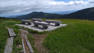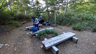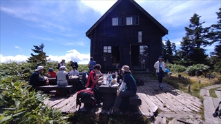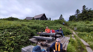 駒ノ小屋の前のベンチで昼食を取る。陽射しが出てきて暑くなってきた。昨日道の駅で買ったお稲荷やお餅を食べたので、お湯を沸かしたが熱いコーヒーよりも温かいお茶にして飲んだ。