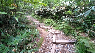 滝沢登山口の階段を登り、すぐに山道となり延々と登りが続く。水場までコースタイムで1時間半なので、それを目標に休憩なしに登り続ける。ただし足の筋肉疲労による痙攣が気になるのでゆっくりペースで登る。多くの登山者に追い越されたがほぼコースタイム通りに水場に到着した。そこにはベンチがあり、数人が休憩していた。