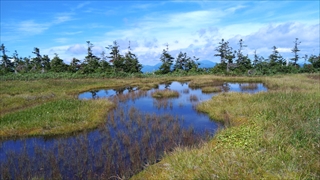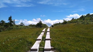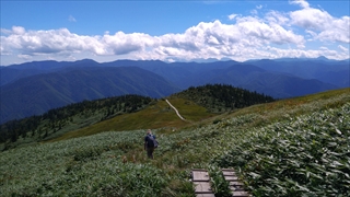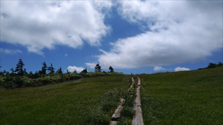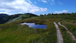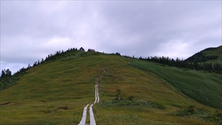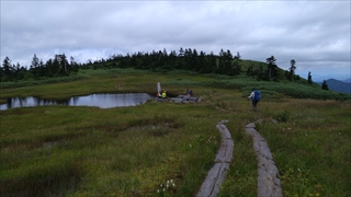 水場から駒ノ小屋までさらに1時間半のコースタイム。休憩なしに登る覚悟で出発すると登山道が案外整備されている。やがて樹林帯を抜け木道が出てきて、また広い湿原が現れてきて小屋が近いことを感じる。