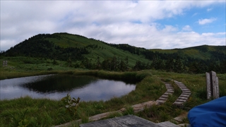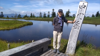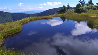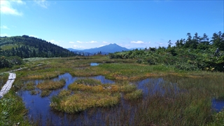 中門岳山頂からの眺めをひととおり味わった後、山頂にある池塘の周りを1周して元来た道に戻る。空の雲もだんだんと少なくなり、時折日が差して明るくなる。今度は燧ヶ岳や至仏山、それに平ヶ岳の山々が望める。