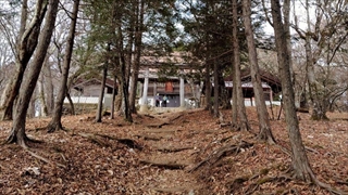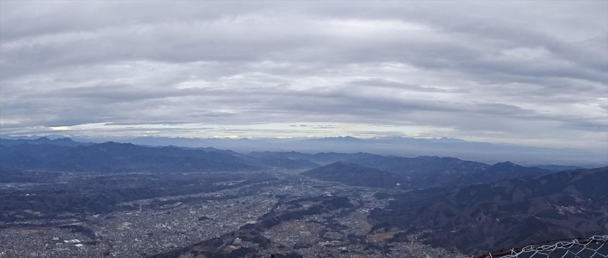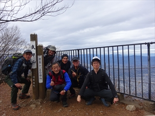 五十丁目の道標を過ぎると御嶽神社の前に出る。その横を通って山頂に出た。山頂は細長い広場となっていて、遠くの方の山々まで見通せた。風もなく時折薄日もさすくらいでちっとも寒くなかった。