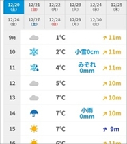 ■12/20(土) 日の出 6:50, 日の入り 16:34 曇り 10.9℃/-1.6℃ 湿度 80%、 北北東 0.8m/s 降水量 0.0mm