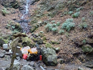 登山道を登っていると道の片隅に時折○○丁目と表示された道標があり、山頂までこの道標が続いていそうだ。途中水場がありそこには水の入ったペットボトルが置かれていた。ここで思い出したが、山頂のトイレの水のために登山者に運んでもらいうことで置かれている。前回は一番小さいペットボトルを運んだことを思い出したが、今回は2L以上のペットボトルしかなく、ここは遠慮させてもらった。