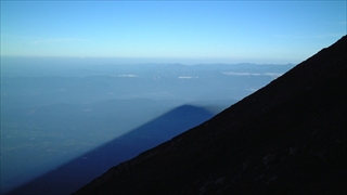 お盆休みで天気予報によれば快晴、そこで急に思い立って富士山に登ってみることにした。朝自宅から始発の電車に乗って河口湖駅、そこからバスに乗り継いで富士山5合目に着いたのは朝の9時。ただちに登りだしたが、延々岩ゴロゴロの登りが続く。3時頃には雲が湧いてきててやっと山頂の小屋に到着したときは4時をまわっていました。すると身体は急に寒くなってガタガタ震えが止まらない。小屋の中に入りふとんにくるまって身体が温まるまで時間がかかった。小屋は超満員、夕食はうわさどおりのカレーでそれも薄い。朝、日の出を迎えるため外に出てみると大勢の人々が日の出を待っている。いろいろな言語が飛び交っていた。それに非常に寒かった。やがて太陽が出て、急に明るくなると今日も快晴。最高峰である剣ヶ峰に登って記念写真。そこには小さな測候所の建物があったが中は無人。お鉢巡りをすると下界に大きな富士山の影が伸びていた。