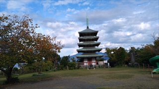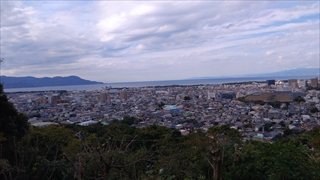 街の通りから急に山道になるがほどなくして開けた公園に出た。振り返るとなぜか五重塔が建っている。また公園の端から沼津市内と駿河湾が望めた。