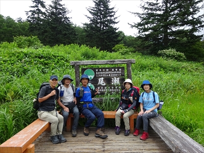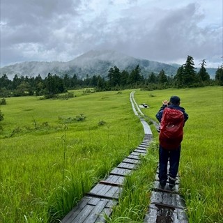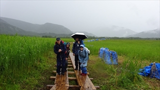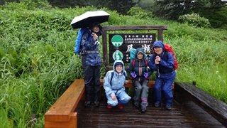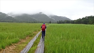 温かいコーヒーで気合を入れ直した後、尾瀬ヶ原の風景をバックに記念写真。さすが雨のせいか人通りは少ない。出会ったのは2~3パーティといったところ。ここから温泉小屋までは平坦な木道が続く。雨は小降りとなり、木道を歩いていると右手に燧ケ岳が姿を現わしていた。