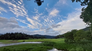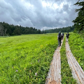 翌日は朝食に合わせて5時に起きると、天気予報では午前中は雨、午後には雨があがるとのあるが、詳しい予報を見ると燧ヶ岳山頂付近では風が10m/s以上との予報。登山道が雨で濡れていること、また山頂で汗をかいた中で強風にさらされると低体温症のおそれもあり、やはり燧ヶ岳登頂は諦めることとした。そこで、長蔵小屋から沼尻、尾瀬ヶ原の入口である見晴を経由して、裏燧ヶ岳の田代を巡って御池に戻るコースとした。