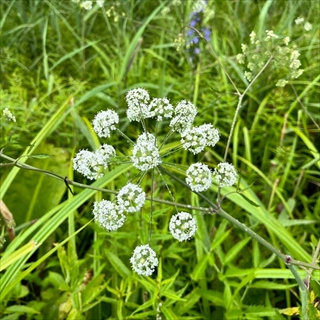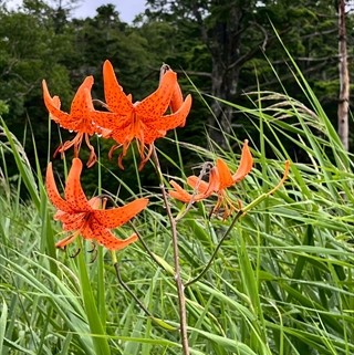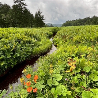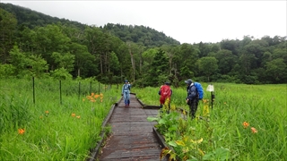 温泉小屋を過ぎて三条の滝への分岐をショートカットして裏燧林道に出る。ここからは天神田代、横田代、姫田代、上田代、御池田代と湿原が続くが、その前に意外に急な林道を上ったり下りたりしながら、また雨水がごうごうと流れる川の上にかけられた細い木道を渡ったり結構苦労を強いられた。その後林道から湿原地帯に入るたびに、湿原の中に咲く花たちに辛さを忘れさせてくれる。やがて広い湿原の中にベンチがあり、昼食にうってつけの上田代に出た。雨もあがり時計は午後2時を過ぎていてお腹もペコペコ、我々だけに解放された大湿原の中で長蔵小屋で受け取った昼食のおにぎりを美味しく食べた。