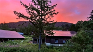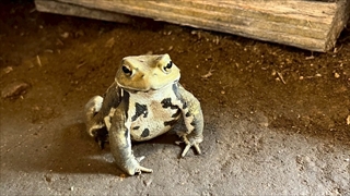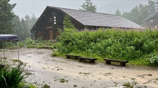 すぐに尾瀬ビジターセンターに着いたが、まだ時間が早いのでビジターセンターでゆっくり展示物や説明案内などをみて過ごす。ひととおり展示物を見て長蔵小屋に向かおうとすると外はざあ~という音とともに大雨になった。長蔵小屋はすぐ側であるが、傘を取り出し小屋に向かう。入口で出迎えてくれたのは殿様カエル。このカエルは入口の土間をすみかにして外で餌をとってはここに戻って来るとのこと。