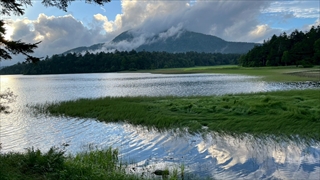 夕食後、雨が上がったので湖畔の夕焼けを眺めにサンダルを履いて尾瀬沼湖畔に行った。燧ケ岳が湖面の向こうでどっしりと構えていたが山頂の雲がなかなか取れない。しだいに夕陽により湖面が光輝き、燧ケ岳の3つのピークがうっすらと姿を現わしてきた。しばらく湖畔に佇んで明日の登頂を期待し小屋に戻った。