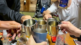 部屋に戻ってささやかな二次会。最悪なケースも想定して東京に帰るバスや電車の時刻などを確認するとともに、ともかく天気を祈りつつウィスキーで乾杯。