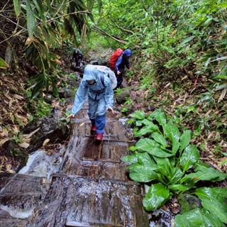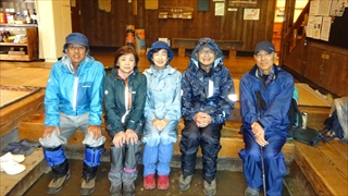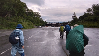 外の雨は本降り、久しぶりにカッパ上下を着用して足元にはスパッツを装着しての完全武装である。カッパ上下を着て小屋を出るのは、思い起こせば北アルプスの笠ヶ岳がそうであったが、あの時は下山するうちに雨は止んでほんのひと時だけであった。今回は一日中カッパを脱ぐことはないであろう。雨の中の出発は覚悟が必要であるが、思い切って外に出ると完全武装であるせいか雨はそんなに気にならなかった。