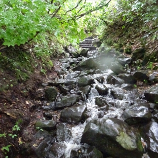 沼尻を過ぎ白砂田代を抜けると道は樹林帯に入っていって、さらに尾瀬ヶ原まで相当下る。下りでは木道が滑りやすく、ある場所では川になっていたりして滑らないよう神経を使う。