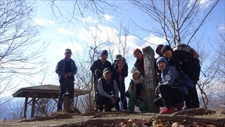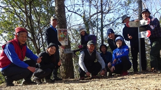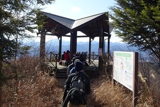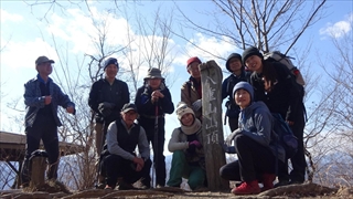 うどんを食べた後、皆さんから配られたお菓子で温かいコーヒーを楽しんだ後、展望台の先端まで行って眼下に広がる甲府盆地と富士山、その周りの山々の景色を楽しむ。またまた全員の記念写真を取って下山する。下山道は南斜面で太陽の陽ざしがあたって暖かい。30分ほどで下山口に到着。
