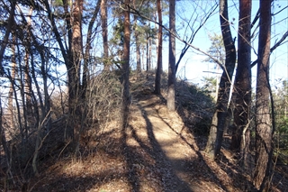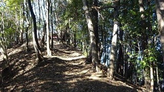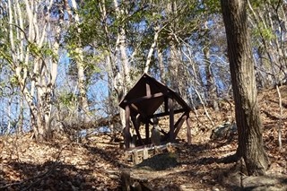 沢山の落ち葉を踏みしめながら高度をあげていきます。登り始めは林の中のため展望はなく、歩くこと約1時間で虎丸山に到着した。古ぼけた社があったが景色はといえば木々の間から遠方の山々が見える程度。ここでは登頂写真だけを撮り次の目的地に向かう。