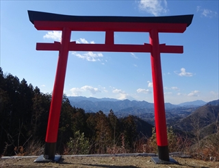 能岳に着くと周囲の木々が伐採されているせいか文字通り360度の大展望。中央線の山々の他、反対側の丹沢山方面も望める。また山頂直下にあるのゴルフ場や山の麓にある集落もはっきり望めた。真っ白な富士山も望めたが臨めたがてっぺんは残念ながら白い雲に覆われている。ここ低山にも関わらずとても見応えのある景色である。しばらく大展望を眺めていると我々とは別方向から上がってきたグループからこの先に赤い鳥居があるので、ぜひ見に行くように勧められた。さっそく荷物をこの頂上にデポして急な坂を5~6分下る。200mmほど下り鞍部に着くとそこには真っ赤な鳥居が富士山方向に向けて建てられていた。ちょうど富士山を鳥居の中に入れて写真を撮れるように作られ、雲のかかってない富士山ならばきっとインスタ映えする写真が撮れるであろう。