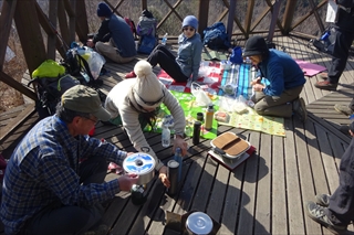 展望台には一組(5人)がテーブルを占領していたが、風もなく暖かいので広いデッキにビニールシートを敷いてうどん鍋の準備を始めた。4台のコンロを使い、お湯を沸かす人、茹でうどんを温める人、スープ用のお湯を作る人、牛丼の具の温める人など自発的に作業を分担し、ほどなくして暖かいうどんが完成した。各自自分のお椀にいれたスープにうどんを入れ、刻みネギ、昆布などを加えて食べ始める。
