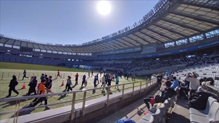 味の素スタジアムの観客席が待機場所となるので、日当たりの良い場所を確保する。スタートが11:00なのでゆっくりである。待つ間誰が何周走るか、また順番など話しあった。その結果、私は第3走者とし最初はひとり1周ずつ、次に2周ということで3回目は状況を見て判断することとした。