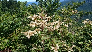 | 夜中2時ごろ目を覚ましてトイレに行った時は、満天の星であったが、朝5時に起きてみるとうす曇りの空であった。それにしても駐車場は昨晩から夜中にかけてどんどん車がきて満車状態である。やはり百名山だなと思う。 いつも朝は食欲がないのであるが、昨晩晩飯を6時ごろ食っていたので、ボリュームのあるサンドイッチと牛乳で簡単に済ませ、出かける準備をする。計画では5時に出発する予定であったが、5時20分に出発。最初は幅の広い道をゆっくり登っていく。そのうち山肌の崩れたガレ場を通過するが、そこから対面の山で雲が滝のように流れている。まだ山道に滝雲ビュースポットという看板まである。説明では銀山湖で発生した霧が朝日が昇って気温が高くなり上昇して淵の山からこぼれるように流れるとのことであった。珍しい風景をみてちょっと得した気分になる。また雲の中から正面に荒沢岳がどーんと控えている。 | |
