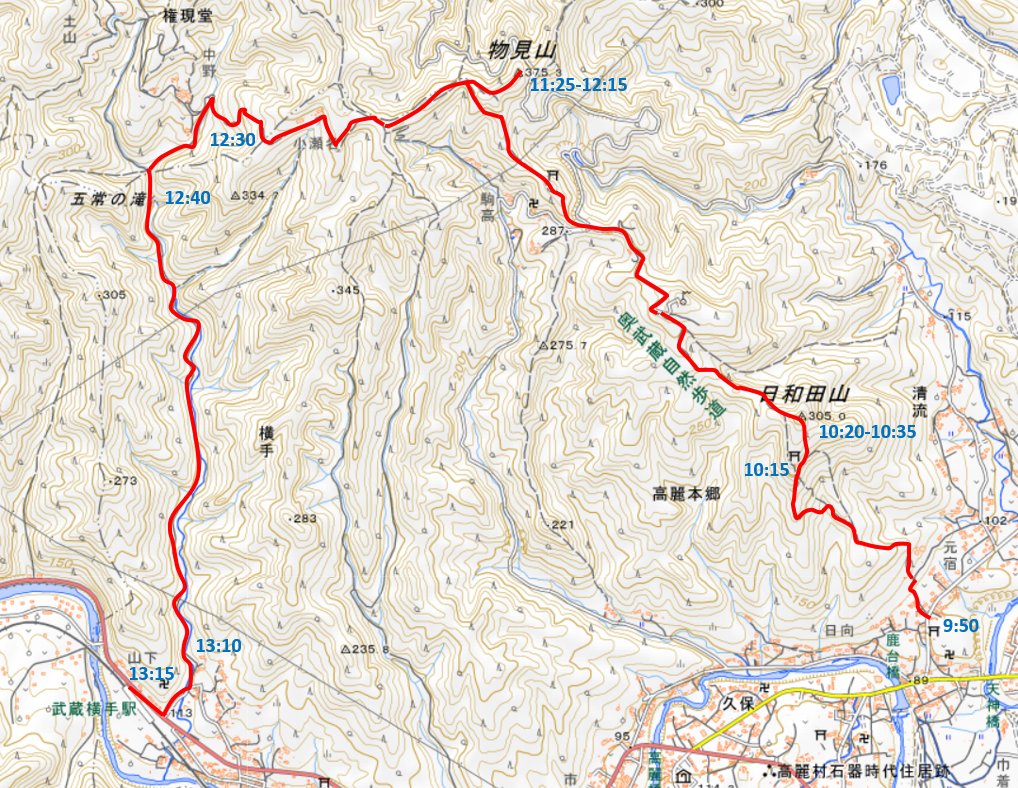 駐車場━日和田山━高指山━物見山━イボ石━五常の滝━武蔵横手駅 | |