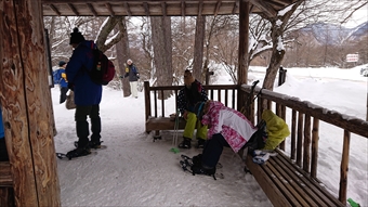 ![]() 赤沼バス停前の東屋でスノーシュー装着 |