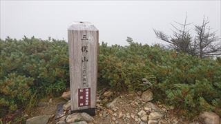 塩見小屋の小さな標識が出てきて左手に小屋の屋根が見えたが、休憩を取らずにそのまま塩見岳を目指す。 塩見小屋からはハイ松帯で、稜線に出たせいか風が強くなる。また手も少々冷たくなってきた。 天狗岩の手間でヤッケと手袋を取り出すも強風と濡れているせいかなかなかヤッケを着ることができない。 手袋もなかなか手に入らなく、右手だけはめて左手は諦めた。 天狗岩からはちょっとした岩場になるが、手でホールドするところが分かるので、そんなに危険はない。 それよりも強風で気持ちが萎えてくる。岩場を通り過ぎると普通の登山道の登りとなり、やっと山頂に到着。 当然ながら、ガスで何も見えず。それよりも登りでかいた汗が強風で冷えて身体の熱が急速に奪われる。 急いでダウンジャケットを着こんだが、なかなか温まらない。とても百名山達成などと祝ってられる状況ではない。 |
