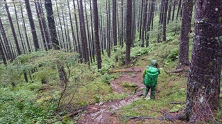 朝食を食べ、待っていても止みそうもないのでいよいよ覚悟を決めて上下のカッパ、ザックカバーを装着して出発。 外に出て、久しぶりの雨の中の山行。幸い昨夜から気温が上がったせいか寒くないので助かる。 |