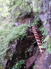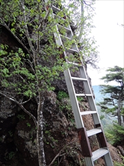 | 途中普通のはしごが無造作に置かれていたり、狭い痩せ尾根を辿ったり、緊張の連続、それにきついアップダウンで体力が消耗される。 最後にシャクナゲの藪を突き進んでやっと開けた鋸山に到着。ようやく緊張がほどけたせいか精神的にも体力的にも楽になった。 | |