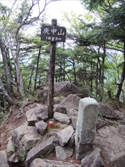 こちらは、食料などわずかばかりの荷物を置いて、そのままザック担いで行くこととした。 鋸山からはまず急激な下りとなる。ここの稜線には登ってくる人ともすれ違う。この急な坂でのすれ違いも滑らないよう気を使うが危険というほどではない。 その後、皇海山のメインルートである群馬県側からの登りと合流する不動沢のコルに着く。そこには老若男女の大勢の登山客が休憩を取っていた。 群馬県側の登山口へのアプローチは強烈な悪路であったはずなのであるが、このような大勢のハイカーらしい登山客に出会うと、さすが百名山の威力である。老いも若きも百名山という訳か。 皇海山への登りは、深い森の中の道でひたすら登ると言った感じで、ロープを張った岩場もある。ほどなくして、劔の標識が見えてすぐに皇海山山頂となる。 山頂はやはり木々に囲まれていて眺望が良くない。木々の間から日光白根山、男体山が見える程度であった。 |
